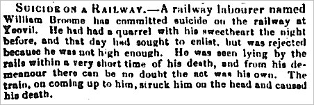 One of the early reported train fatalities in Yeovil, was in the 2 December 1854 edition of the Gloucestershire Chronicle - William Broome's 'suicide by train'.