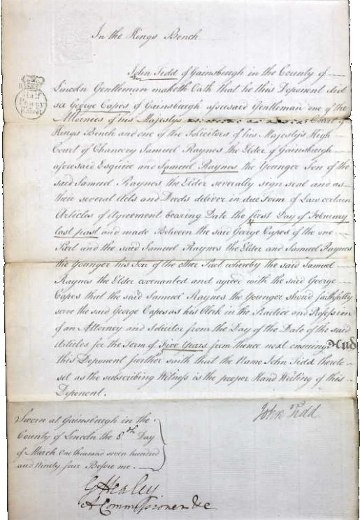 It appears that the family moved to Gainsborough, Lincolnshire, where Samuel the Elder became a partner in the Gainsborough Bank (the partnership was dissolved on 3 August 1799). On 1 February 1794, 16-year-old Samuel Raynes the Younger of Gainsborough, was tied for five years as an articled clerk to George Capes - with the agreement of Samuel Raynes the Elder, also of Gainsborough.