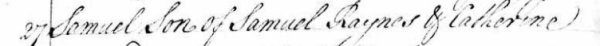 Samuel Raynes was born in Lambeth, Surrey, in 1777 and baptised at St Mary at Lambeth church, Lambeth, on 27 November 1777. He was sixth of the nine children of banker Samuel Raynes (1745-1811) and his second wife Catherine Minnett (1750-1834). Samuel and Catherine's children were; Martha (1771-1771), Michael Minnett (1772-1852), John Thomas (b1774), Elizabeth Sophia (1775-1856), Francis (1776-1866), Samuel Junior, George (1779-1828), Catherine (b1784) and Mary Ann (1787-1854).