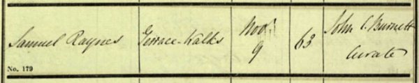 Samuel Raynes, of Terrace Walks, Bath, died in Bath on 2 November 1840, aged 63, and was buried at St James' church, Bath, on 9 November 1840. The graveyard no longer exists and the area is now a park. There is no monument or inscription concerning Samuel Raynes.