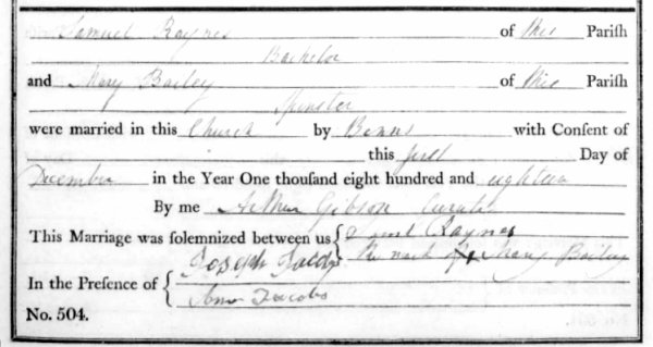 The record of the 1 December 1818 marriage of Samuel Raynes and Mary Bailey from the parish register of St Mary, Lambeth.