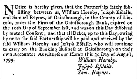The notice in the 10 August 1799 edition of the London Gazette concerning the dissolving of the Gainsborough Bank partnership in which Samuel the Elder was a partner.