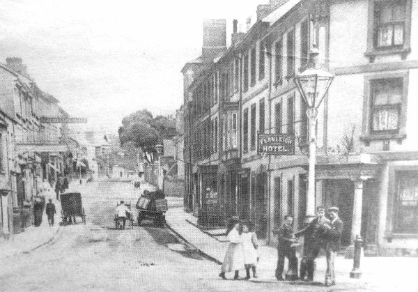 A photograph of Lower Middle Street, dating to about 1900, shows the Railway Inn at extreme left projecting slightly beyond the terraced building next to it. The photographer is standing roughly outside where the William Dampier is today and looking along the eastern end of Middle Street with Station Road (now Old Station Road) at right. The large building on the junction at right was the Fernleigh Temperance Hotel and was most recently an Indian restaurant. Charles Ripper's grocery shop is on the right of the photograph (note the split-level pavement as seen in the previous photograph) where the sign projects into the street.