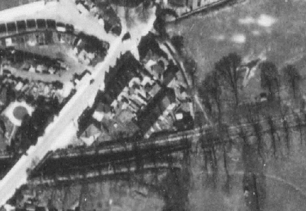 The aerial photograph of 1946 showing Somerset Place at centre. Above and to the left is Aldon Terrace and the Railway Hotel. The railway line runs across the photograph, almost touching the southwestern house of the terrace (although the railway is in a cutting at a lower level at this point). Hendford Hill runs diagonally from centre top to bottom left. The field in the top right quadrant is now the site of Goldenstones Leisure Pool.