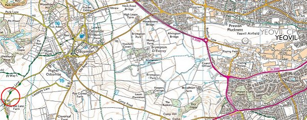 The modern OS map showing the location of Yeovil's 'Starfish' site at today's Street Lane Farm in the lower left corner of this map (and circled red), to the southwest of Odcombe.