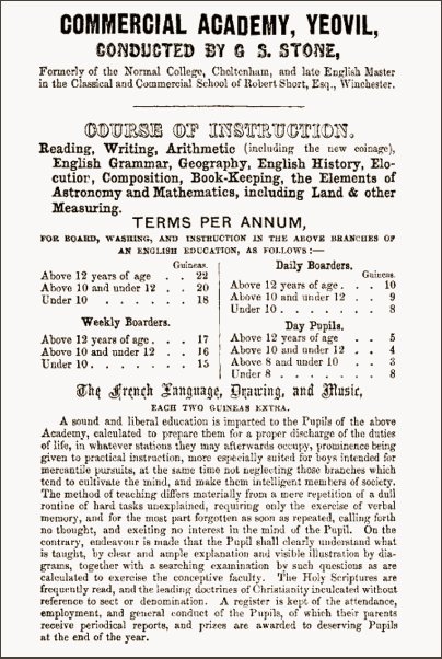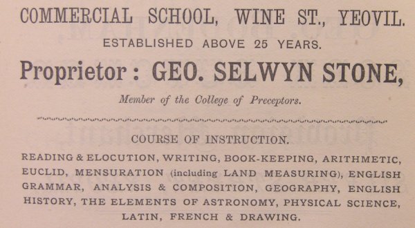 During the 1850s George returned to Yeovil and set up his own Commercial School in Wine Street. As seen in the advertisements below, George's comprehensive course of instruction included "Reading & elocution, writing, book-keeping, arithmetic, Euclid, mensuration (including land measuring), English grammar, analysis & composition, geography, English history, the elements of astronomy, physical science, Latin, French & drawing". Whether or not George taught all the subjects himself is not known.