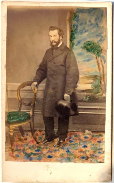 George Selwyn Stone in a hand-coloured carte de visite, dated 1864, by Barry & Gilley of the Strand, London.
