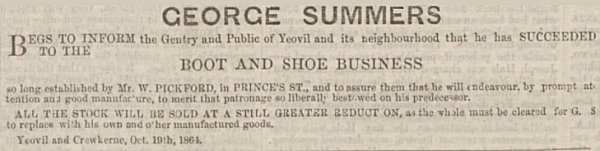 In 1864 George moved to Yeovil, taking over the established boot and shoe business of Mr W Pickford at 5 Princes Street.