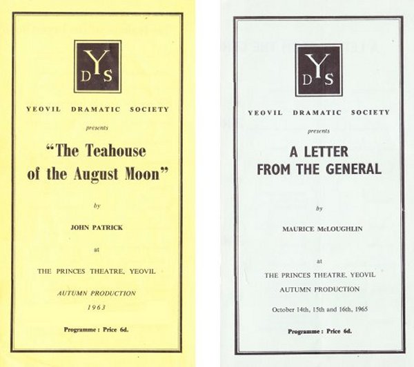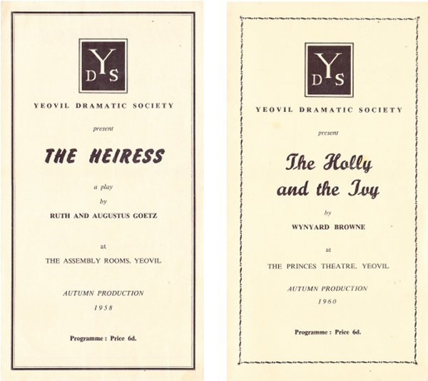 Early programmes of performances by the Yeovil Dramatic Society. At left from a 1958 performance at the Assembly Rooms in Princes Street and at right from a 1960 performance at the Princes Theatre (the re-named Assembly Rooms).