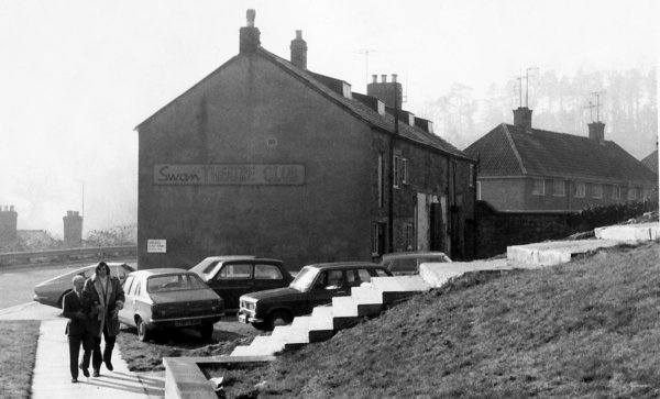 A photograph of 1974 showing the Swan Theatre Club (formerly the Swan Inn and now the Swan Theatre) as seen before construction began to create the theatre behind the existing building. Note too the Penn Steps alongside running up to Penn Hill.