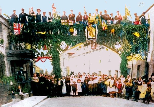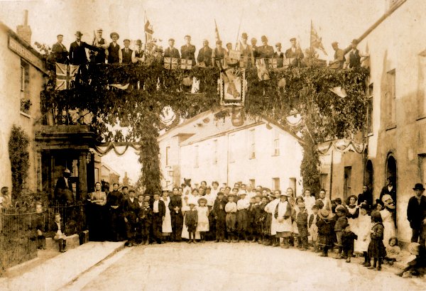 Celebrations at the Swan Inn (at left) - to celebrate the coronation of King George V on 22 June 1911 (instead, it may celebrating the 1902 coronation of Edward VII). At this time Walter Feltham was licensee - with his wife, Sophia, with her arms crossed and by the porch of the Swan.