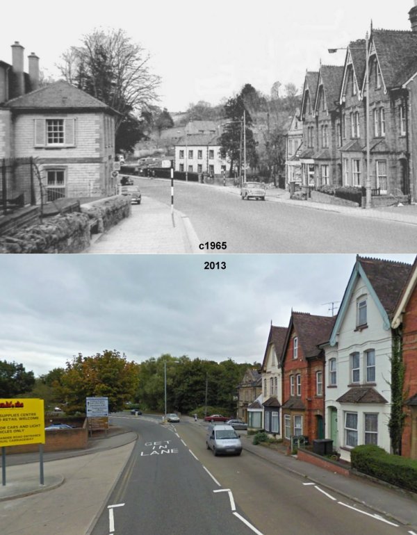 Aldon Terrace, at extreme right, and the Railway Inn next to it remain unchanged. The white building at centre of the top photograph was the Patent Twine Works in the 1880's and demolished in the 1980's.