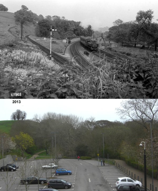 Looking east from Newton Road bridge just before the railways disappeared completely from the centre of Yeovil showed a plethora of tracks skirting the southern flanks of Wyndham Hill at left. Now a delightful car park with Railway Walk following the left-hand track in the top photo.