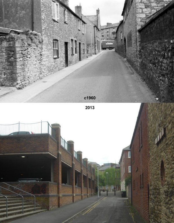 I lived in West Hendford from 1974 to 1980 and walked along here every day but, to be honest I really can't remember it looking like either of these photos, so I'm guessing the top one was demolished before then and the bottom one hadn't been built. Facing us in both photographs is the Three Choughs Hotel.