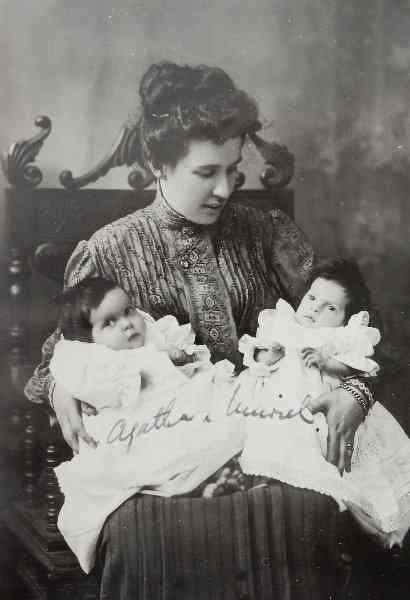 Ruby Titball with 14-week old twins Agatha Margaret 'Fay' and Muriel Alice - photographed on 28 February 1912.
