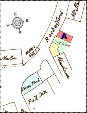 There is only one reference to a public house called the Trumpet (marked as 'A' on the map at right) and that is in a 1769 Conveyance as shown in the documentation below. Leslie Brooke, in his notes, wondered if the Trumpet could have been an early name for the Pall Tavern. However it couldn't possibly have been the Pall Tavern for one simple reason - the conveyance documented below clearly states that the Almshouse was to the south of the waste ground (coloured green on the map) being conveyed and the Trumpet was on the east of the waste ground, making the Trumpet north and east of the Almshouse, whereas the Pall Tavern is known to have been to the west-southwest of the Almshouse. |