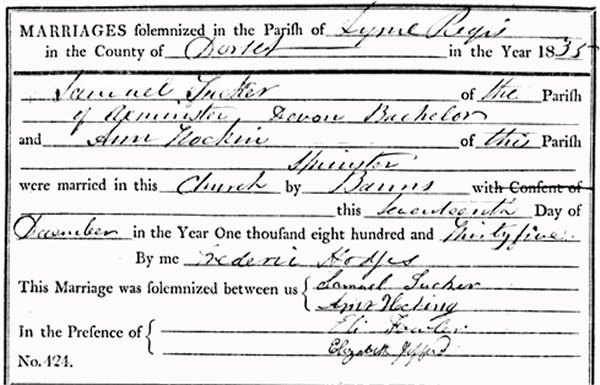By 1835 Samuel was living in Axminster, Devon and on 17 December that year, at Lyme Regis, Samuel married Ann Hocking of Axminster. Both Samuel and Ann were able to add their signatures to the marriage certificate. Samuel and Ann were to have nine children; Elizabeth born 1838, Samuel born 1840, Emmanuel born 1842, John born 1844, William born 1847, Mary Jane born 1848, Henry born 1850, James born 1852 and William Jewett born 1854.