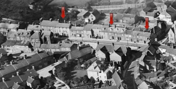 An aerial photograph of the northern end of Park Street showing (arrowed, left to right) the Rifleman's Arms, Samuel Tucker's house and the Globe Inn.