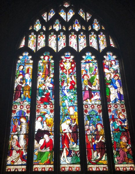 The north window of the North Transept. Dating to 1879, this was the last of the Victorian windows to be inserted and depicts the Ascension with disciples, and above is the angelic host with figures of the Patriarchs below. The window is by Hardman of Birmingham and its cost of £250 (about £105,000 at today's value) was borne by the Feoffees of the Church Lands.