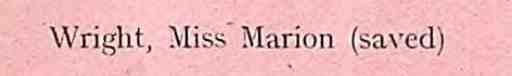 Marion Wright's name in the Crew Records of RMS Titanic, indicating passengers who survived or were missing, in which it is noted that she was saved.