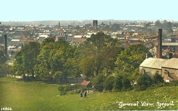 This view across Yeovil from Wyndham Hill dates to about 1900. Note the glove factories at centre and the factory chimneys.
