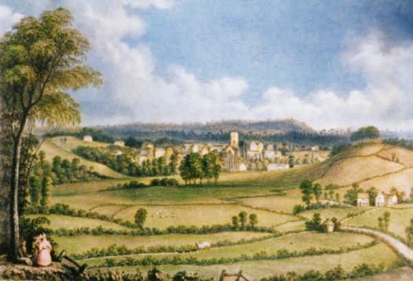 Yeovil seen from Babylon Hill in the late 18th century from a lithograph by T Jerome. Penn Hill is seen at left, surmounted by Penn House, and Wyndham Hill is seen at right with the buildings of Pen Mill at its foot.