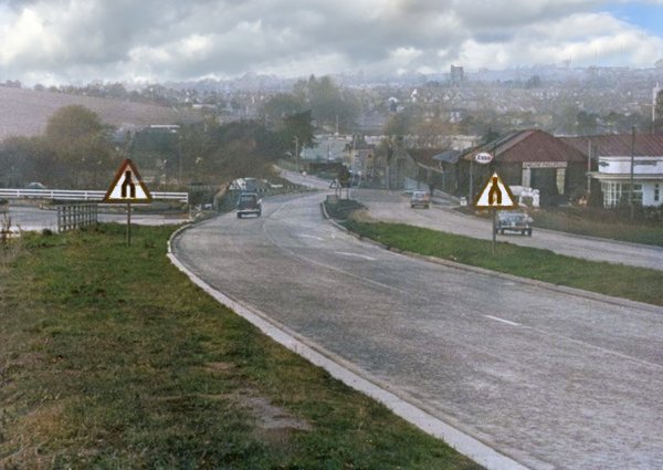 Seen from Yeovil Bridge in a colourised photograph of the 1960s, with the Toll House at left, the new dual carriageway begins its ascent of Babylon Hill in the distance.