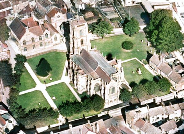 A colourised photograph of St John's churchyard photographed in the mid-1960s. Church Street is at centre and runs off to bottom left while Church path runs from centre to right, past St John's schoolrooms and the Chantry.