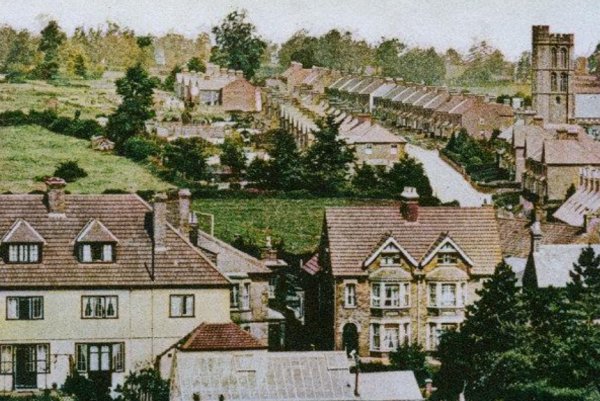 Enlarged from a postcard, this photograph was taken in 1913 from the top of Wyndham Hill, looking north. Across the bottom of the photograph are the houses of Sherborne Road, at top right is St Michael's church and running from top centre to centre right is St Michael's Avenue. At centre, by this time devoid of its apple trees, is just glimpsed Turnpike Orchard.
